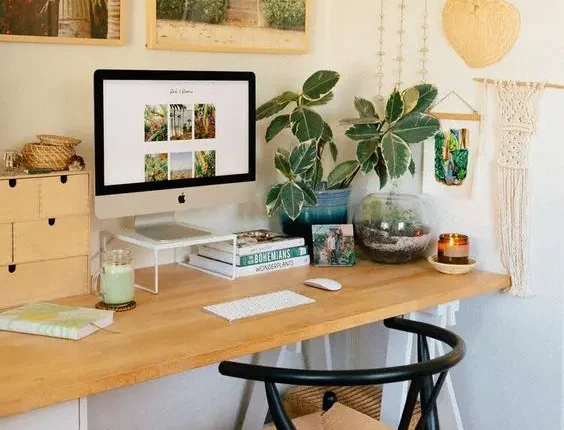 For a cozy, creative workspace, the bohemian style combines warmth, vibrant colors, and eclectic decor. Layer textiles such as woven rugs, throw pillows, and curtains for a relaxed atmosphere. A mix of wood, brass, and terracotta elements adds texture to the space, while an inviting armchair or pouf creates the perfect reading corner.