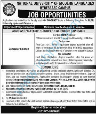 Download the job advertisement for NUML Hyderabad Campus 2025