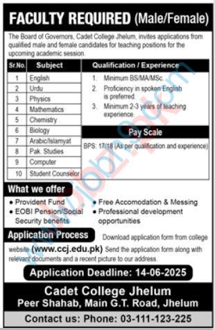 Here are the latest job openings at Cadet College Jhelum for 2025: