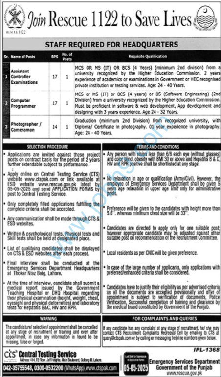 The following new jobs 2025 are available at Punjab Emergency Service Rescue 1122 Faisalabad:
