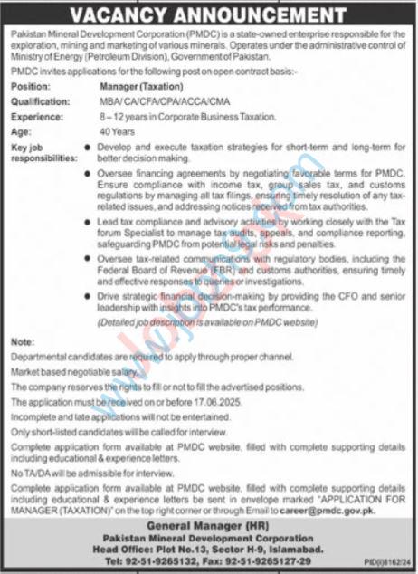 Login to Send MessageAre you looking for govt jobs 2025 or planning your next big career move? Great news! Pakistan Mineral Development Corporation (PMDC) has announced a new position for a Taxation Manager in 2025. This is one of the best chances to grab a stable and well-paying government job with a respected organization.